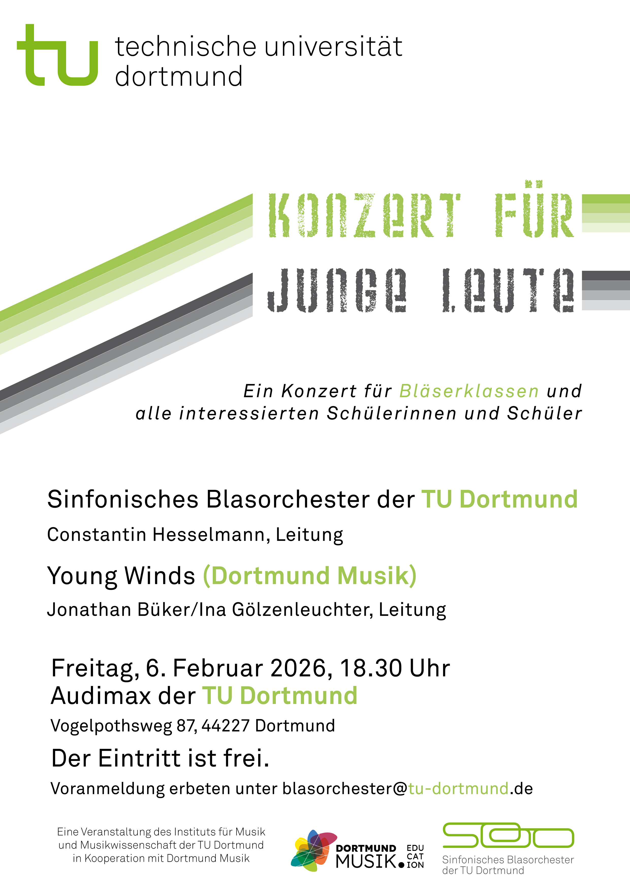 Dass die intensive Beschäftigung mit Musik sich spürbar positiv auf die kindliche Entwicklung und Sozialisation auswirkt, gilt als wissenschaftlich belegt. Das Konzept der Bläserklassen will dem Rechnung tragen, indem es Schülerinnen und Schülern ermöglicht, ein Instrument zu erlernen und als Bläserorchester gemeinsam zu musizieren. An diese Bläserklassen und alle Interessierten richtet sich das Angebot des Sinfonischen Blasorchester der TU Dortmund (SBO): Während eines großen Konzertabends im Audimax stellt das universitäre Ensemble unter der Leitung von Constantin Hesselmann die Vielseitigkeit eines Blasorchesters vor. Leichte Stücke, wie sie von den Bläserklassen selbst einstudiert werden, erklingen in dem etwa 1 ½-stündigen Konzert ebenso wie anspruchsvolle sinfonische und solistische Werke oder unterhaltsame Stücke wie Filmmusik oder Musical-Hits. Dazu bietet eine unterhaltsame Moderation die wichtigen Fakten und Informationen. Bläserklassen-Schüler sind herzlich eingeladen, so dass es einen regen Austausch untereinander, aber auch mit den „großen“ Musikern von der Universität geben wird.